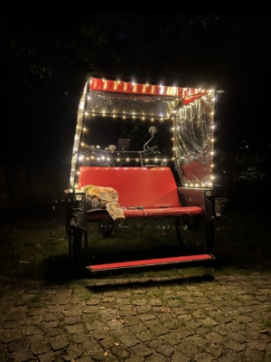 Our e-rickshaws seat two adults plus one or two kids. The bench is 100 cm wide—please check that you’ll fit comfortably.↩